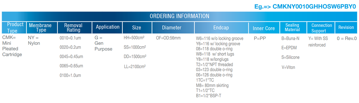 CMK Pleated Cartridge Filters with Nylon 66 membrane are 100% integrity tested; it is constructed of single layer hydrophilic nylon66 membrane. It offers broad chemical compatibility, higher filter area with high flow rates at low pressure drops, and low extractables.