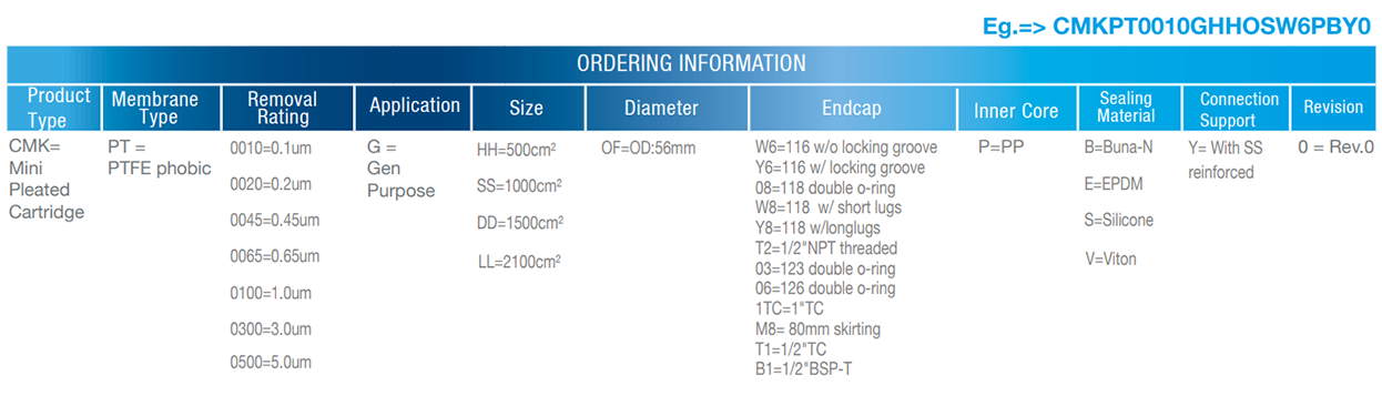 CMK Grade Filter hydrophobic PTFE cartridge are 100% integrity tested; it is constructed of single layer sterilizing expanded polytetrofluoroethylene membrane. It offers broad chemical compatibility, higher filter area with high flow rates at low pressure drops, and low extractables.