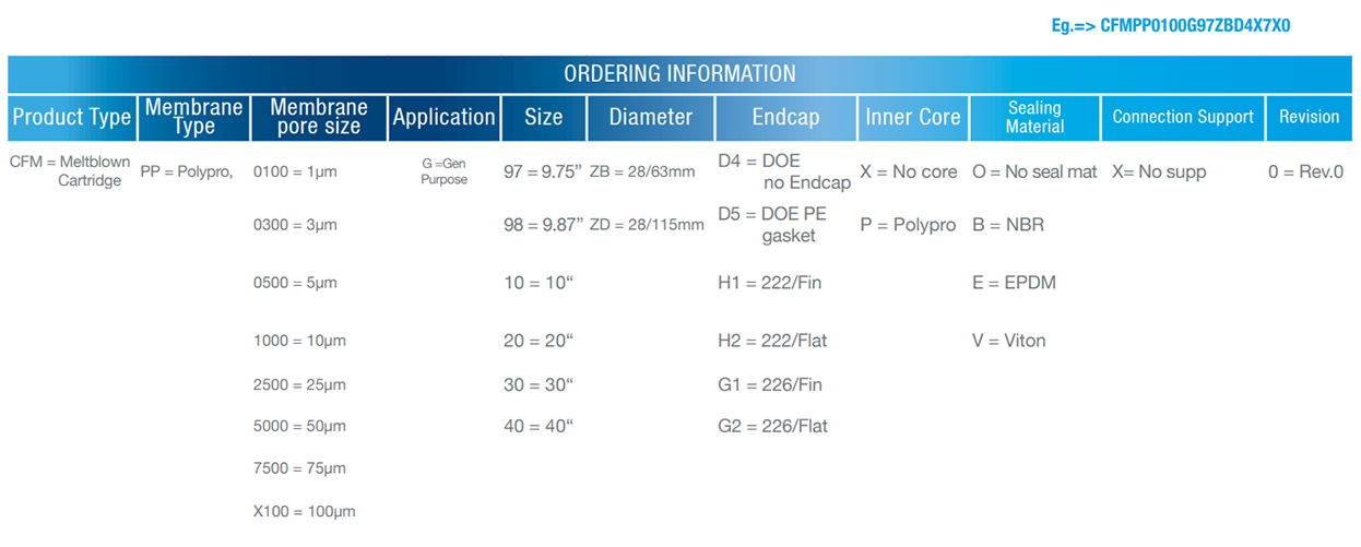 CFM series PP Melt Blown Standard Filter Cartridges are fused and intertwined with polypropylene resin without any chemical glues. The cartridge is glued at random to form 3D micro porea which will make the cartridge’s 3 layers with fibers on the surface and inside. With the fiber, density from high filtration rating, strong pollutants hold capacity, low pressure drop, gradual changing structure loose outside and close inside, it can remove contaminant effectively,-such as suspended substance, particulate and rust, providing efficient filtration and long service life.