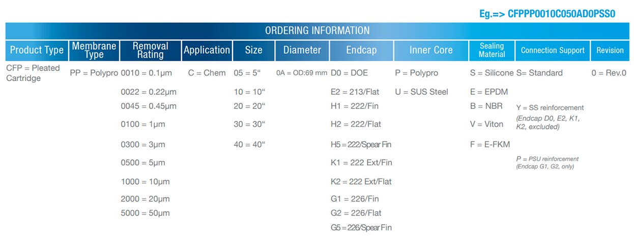 CFP series Nominal Rated PP Pleated Filter Cartridges are all-polypropylene filter cartridges made with submicron fine fiber filter media which provide smaller pores. It is fabricated without using any binders, adhesives, plasticizers, and surfactants. These filter cartiges can be repeatedly hot water sanitized. The filter media and its support structure are thermally welded to the end caps, making integral filter cartridges of minimum extractables in a wide range of fluids and applications. All the filter cartridges are manufactured in a clean room environment.