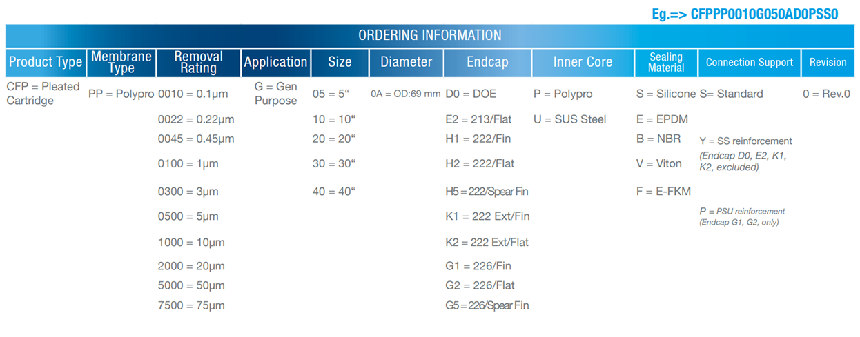 CFP series General Aplications PP Pleated Filter Cartridge are all-polypropylene filter cartridges in economically efficient design, suitable for a wide range of process applications. The pleated polypropylene filter material provides a large filtration surface area which allows for maximized flow rate in the system. PP Pleated Filter Cartridges are available in nominal retention ratings from 0.1 to 50 micron.