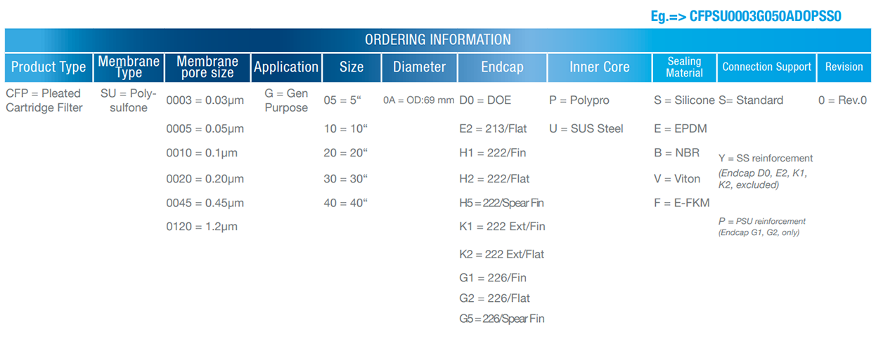 CFP series General Applications Pleated PSU Filter Cartridges is constructed of highly asymmetric hydrophilic polysulfone membrane and polypropylene components. The unique PSU membrane delivers a high flow rate, long life time, and excellent particle removal efficiency. All the cartridges are made in a controlled clean room environment. The cartridges are ideally suitable for filtration of water-based fluids.