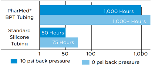 The performance of tubing in peristaltic pumping applications is affected by the conditions of use and equipment utilized, along with size and wall thickness of the tubing tested. The data above is presented for information only and should not be utilized for specification purposes.