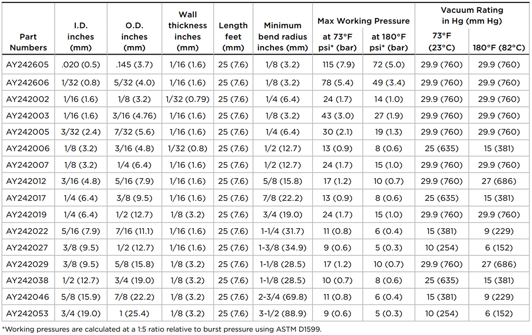 The values listed for working and burst pressures are derived from tests conducted under controlled laboratory conditions. Many factors will reduce the tubing’s ability to withstand pressures, including temperature, chemical attack, stress, pulsation and the attachment to fittings. It is imperative that the user conduct tests simulating the conditions of the application prior to specifying the tubing for use.